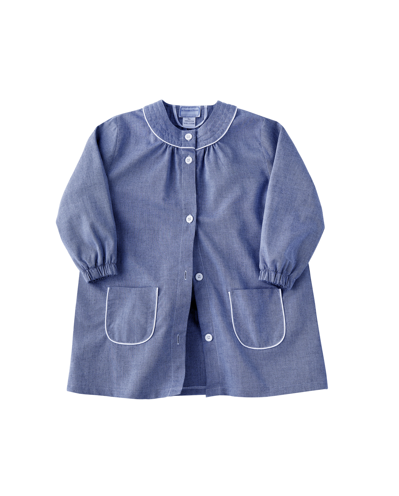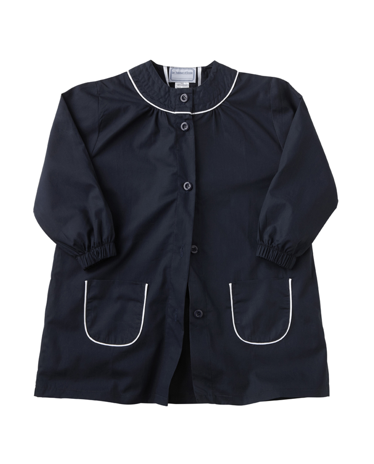 Tablier fille de forme trapèze, encolure ronde doublée et surpiquée d’un passepoil blanc
